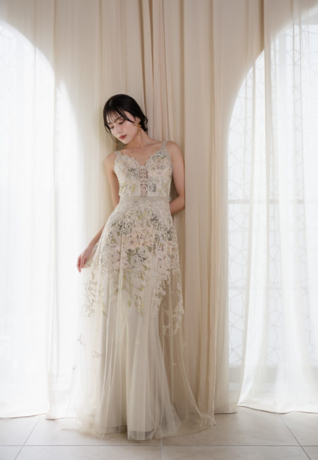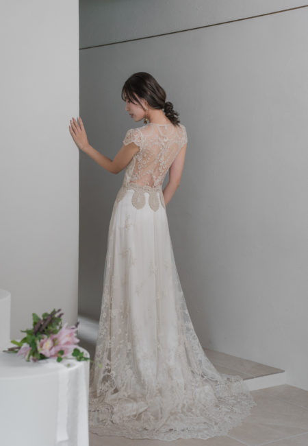 ivoryに見えるレースには微かに光る繊細なgoldの糸が織り込まれ、上品な華やかさが特徴のドレス。