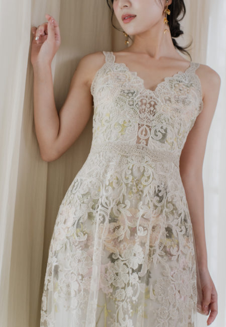 立体感あるフラワーモチーフが胸元やスカートの裾に流れるように施され、レースに奥行きを与える1着。