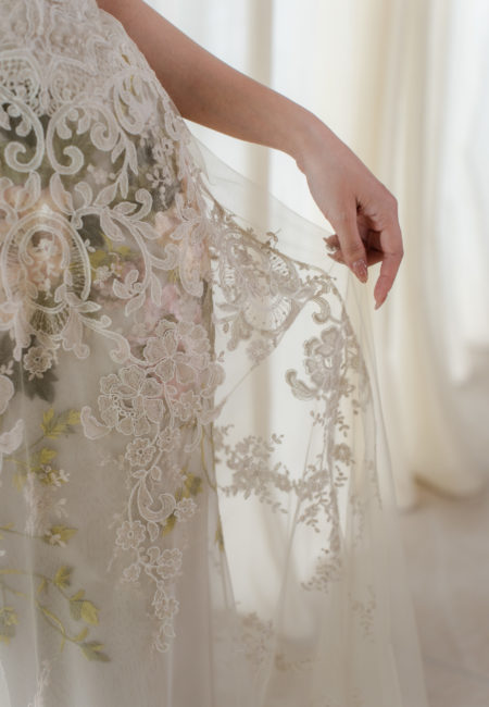 肩にかかるモチーフと、そこから流れるように施されたレース。