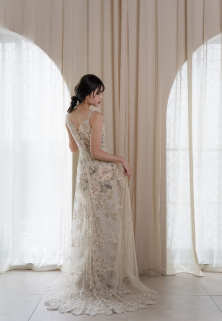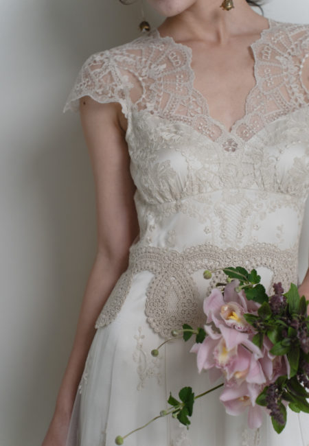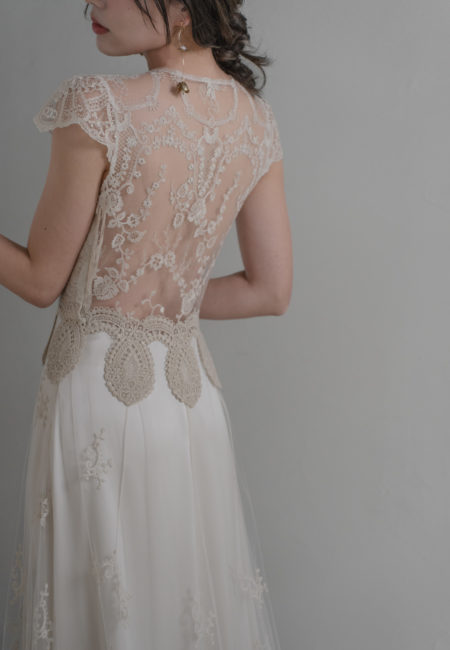 柄の違うレースを贅沢に組み合わせ、claireらしい独特な世界観が作り上げられた印象的なドレス。
