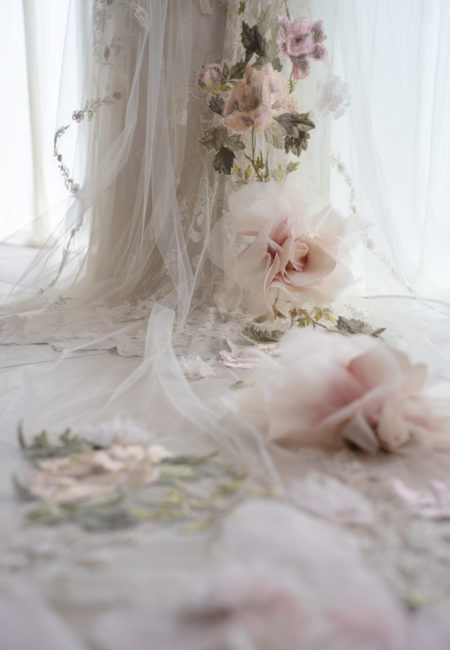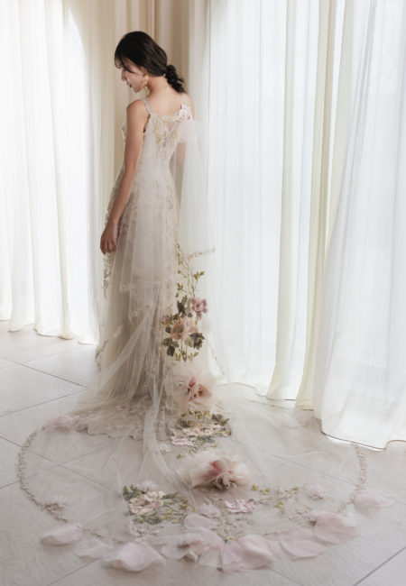 人気のChantilly gownのトレーンを長くカスタムした当店だけの特別な1着。