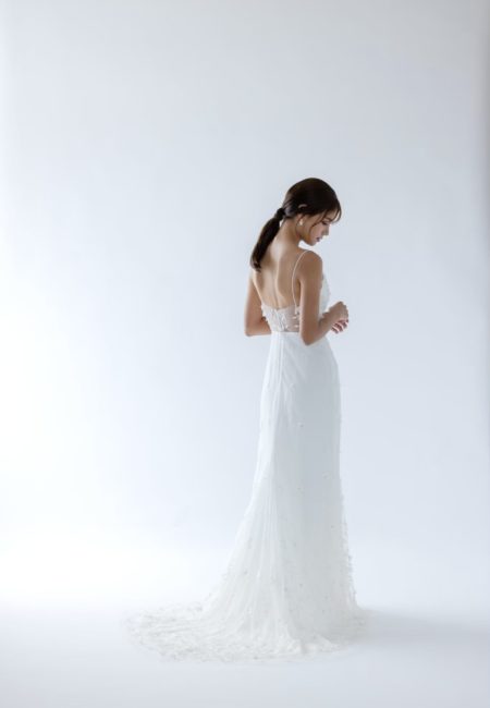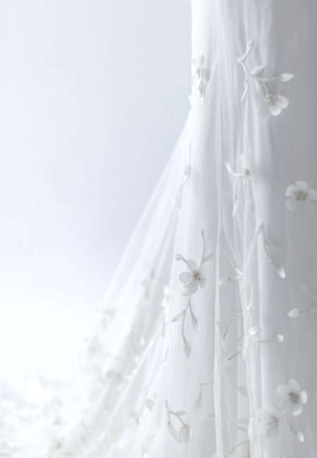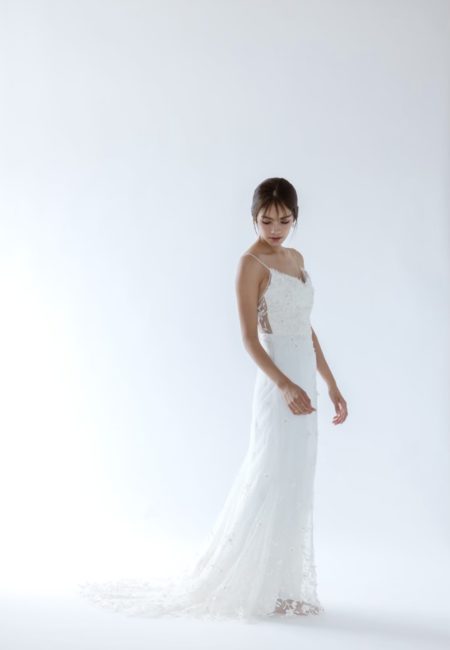 立体感あるフラワーモチーフがトレーンの先まで流れるように散りばめられたドレス。 モチーフの中に優しく輝くビージングが施されており、ドレスの魅力を引き立ててくれます。 華奢なスパゲッティストラップがデザインをより繊細に見せます。